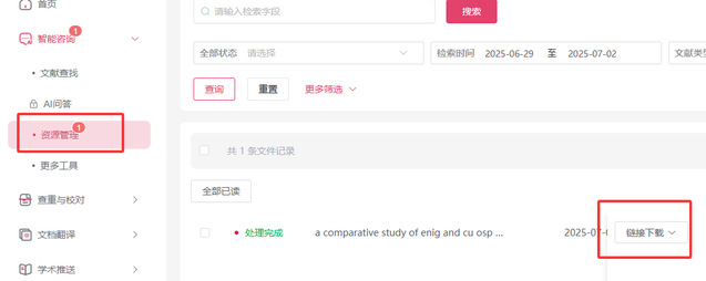 (2)提交后在线等待或在“资源管理”中查找结果,通过平台给出的下载链接下载原文即可。(1-2分钟内)