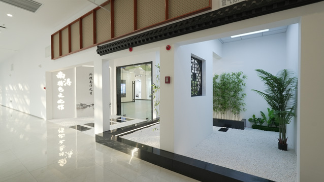 展馆整体采用“因水而兴”的设计理念,巧妙融入江南水乡建筑元素,通过一步一景的空间叙事,构建起依水而生、丝话南浔、非遗之花、水孕群贤、诗书之邦、阅读自习区六大主题展区。具体通过三大展陈单元展现南浔文脉:“人家都住水云乡”——依水而生的鱼米之乡、“桑蚕吐出致富丝”——因水而兴的丝绸文化、“深藏文化百世间”——伴水而盛的南浔人文,通过文字、图片、实物、影像等可视化方式,展示南浔的地理环境、特色古建筑、商业文化、非遗文化、群贤名流、特色文献。